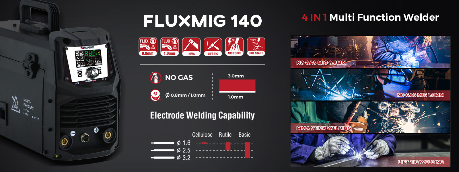 - FUNCTION: NO GAS MIG(Flux wire. 0.8/1.0mm) / LIFT TIG / MMA